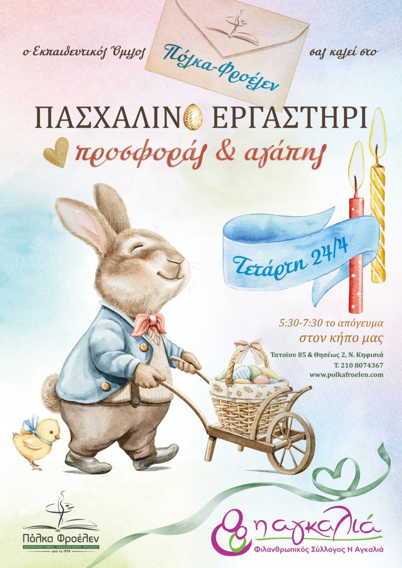Ο Εκπαιδευτικός Όμιλος «Πόλκα – Φροέλεν», που ασχολείται με τον χώρο της προσχολικής αγωγής και εκπαίδευσης, διοργανώνει Πασχαλινό Εργαστήρι Αγάπης, αφιερωμένο στον Φιλανθρωπικό Σύλλογο «Η Αγκαλιά».