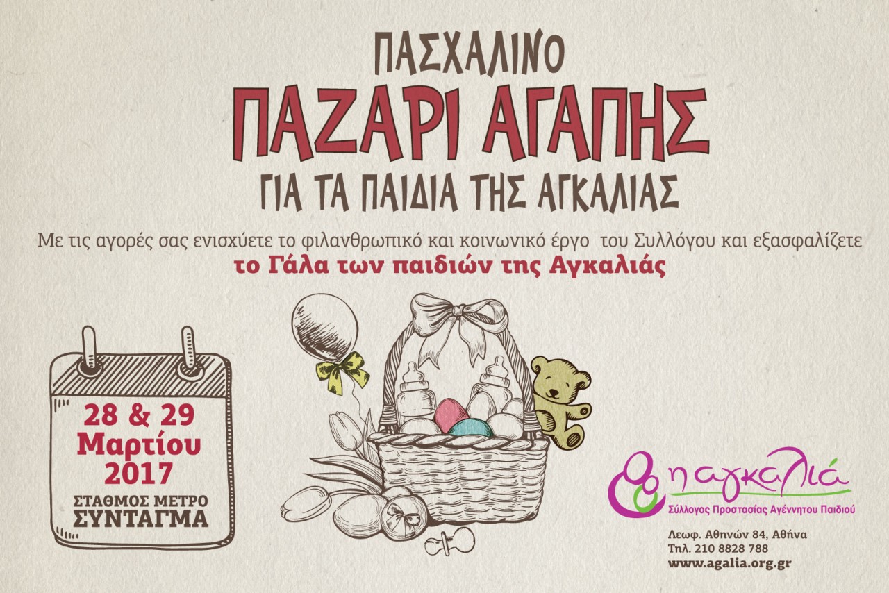 Ο Σύλλογος Προστασίας Αγέννητου Παιδιού – Η Αγκαλιά ενόψει των εορτών του Πάσχα, διοργανώνει Πασχαλινή Αγορά (Παζάρι Αγάπης για τα παιδιά της Αγκαλιάς) στην αίθουσα πολλαπλών χρήσεων του ΜΕΤΡΟ, στο σταθμό «Σύνταγμα» την Τρίτη 28 Μαρτίου 2017 από τις 08:00 π.μ. έως τις  9 μ.μ και την Τετάρτη 29 Μαρτίου 2017 από τις 08:00 π.μ. έως τις 9 μ.μ. Οι επισκέπτες θα ενημερωθούν για το έργο και τις δράσεις της Αγκαλιάς και θα έχουν μεγάλες ευκαιρίες αγορών.