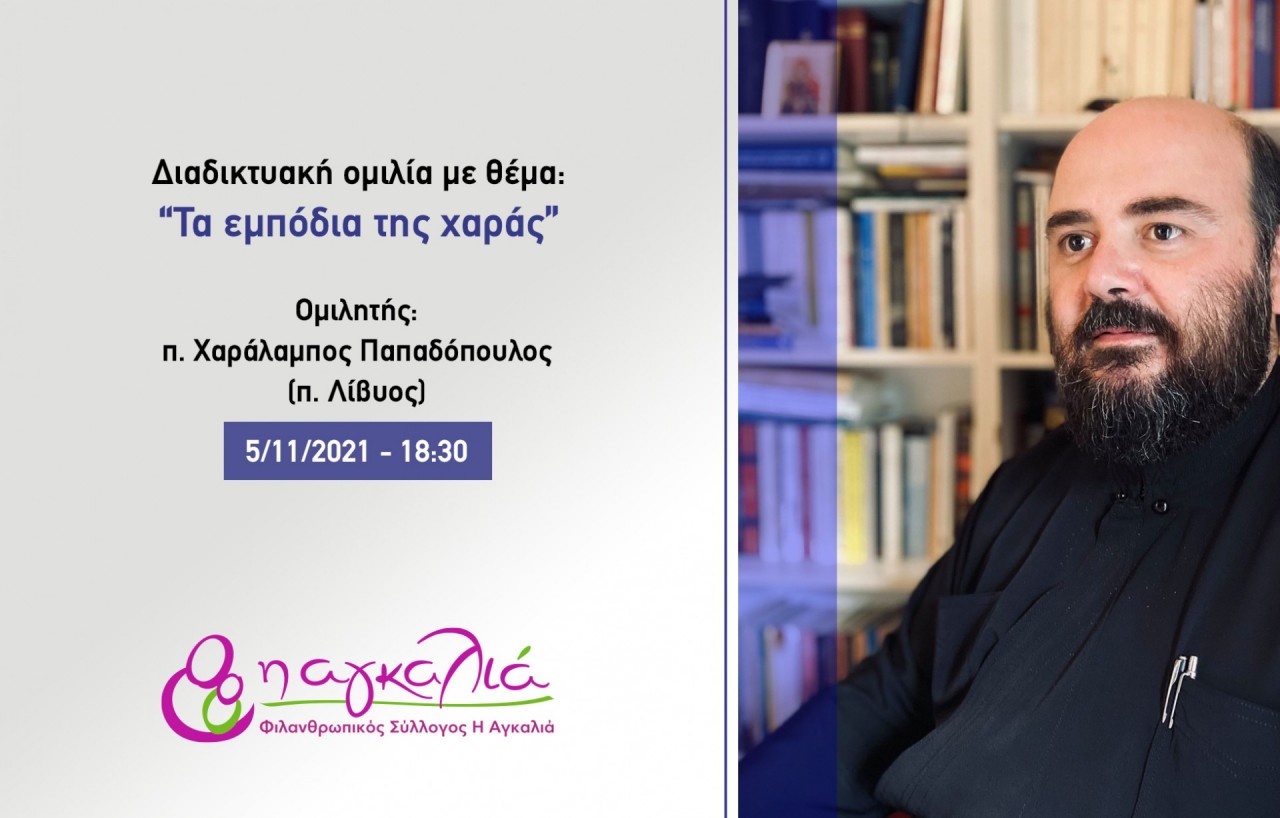Η Αγκαλιά διοργανώνει την Παρασκευή στις 05/11/2021, στις 18:30, διαδικτυακή ανοικτή ομιλία με θέμα «Τα εμπόδια της χαράς». Ομιλητής θα είναι ο π. Χαράλαμπος Παπαδόπουλος (π. Λίβυος). Η ομιλία θα πραγματοποιηθεί μέσω ZOOM.