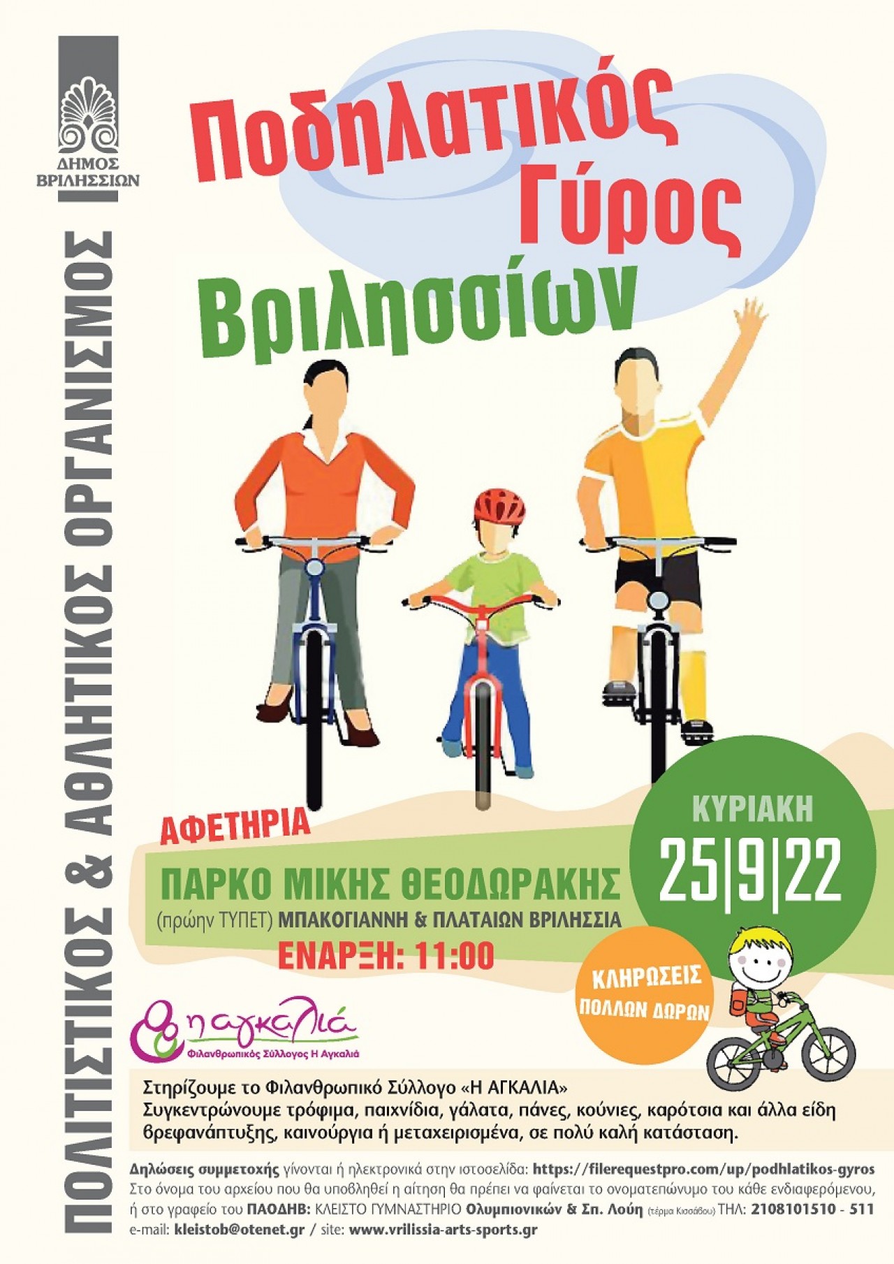 Ο Σύλλογος Η Αγκαλιά θα βρίσκεται στον Ποδηλατικό Γύρο που διοργανώνει ο Πολιτιστικός & Αθλητικός Οργανισμός Δήμου Βριλησσίων την Κυριακή στις 25/9 και ώρα 11:00 στο Πάρκο ΜΙΚΗΣ ΘΕΟΔΩΡΑΚΗΣ (πρώην ΤΥΠΕΤ), Μπακογιάννη & Πλαταιών, με σκοπό να ενημερώνει για το έργο και την δράση του και να παραλαμβάνει τις προσφορές του κοινού.