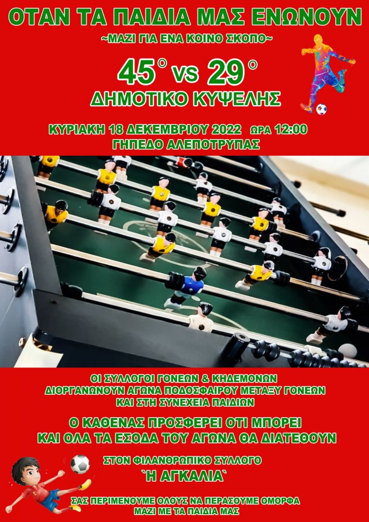 Οι Σύλλογοι Γονέων του 45ου και 29ου δημοτικών σχολείων Κυψέλης διοργανώνουν ποδοσφαιρικό φιλανθρωπικό αγώνα μεταξύ γονέων και μεταξύ μαθητών των σχολείων, την Κυριακή στις 18 Δεκεμβρίου 2022 και ώρα 12:00 στο γήπεδο «Αλεπότρυπα».
